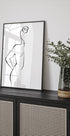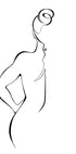 Eine minimalistische Strichzeichnung einer Frau von hinten, ausgeführt mit fließenden schwarzen Linien auf einem hellweißen Hintergrund. Dieses abstrakte figurative Kunstwerk betont Einfachheit, Eleganz und Form und ist ideal für moderne und minimalistische Innenräume.